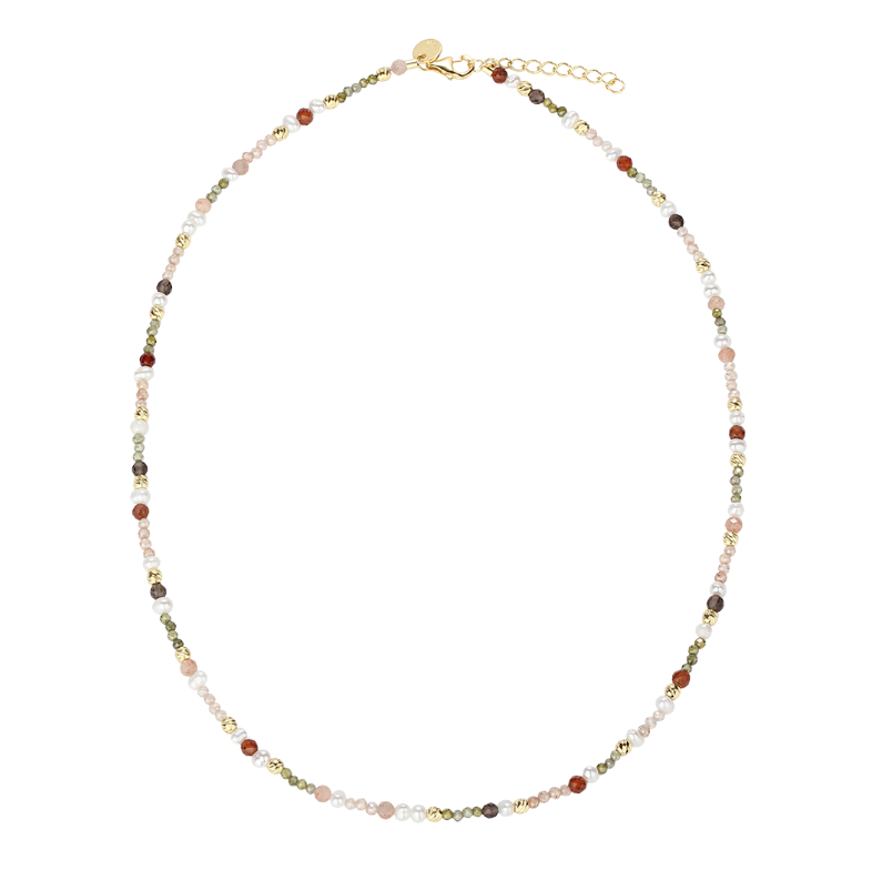 Halskæde i forgyldt sterling sølv med rosa, oliven, røg og rust farvet sten, perler & twistet forgyldte sølvkugler.